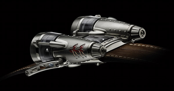 The crew at MB&F have released a limited edition take on their stunning horological machine number four, the MB&F HM4 Razzle Dazzle Watch. The MB&F Thunderbolt watch has been given a limited styling in two options, named Razzle Dazzle and Double Trouble. The HM4 watch was originally inspired by the aviation technology of the mid 20th century, and these limited edition versions continue that theme. The Razzle Dazzle, shown above, has been given a riveted texture and a “nose art” stencil on the body, much like the paintings that appeared on the flying fortresses of World War II. The watch band itself continues the vintage feel, where the watch takes on the character of an aviation watch from the same period. The contrast between the high tech futurism of the MB&F brand and this vintage homage to aviation makes for a stunning timepiece. Hey, that’s just what MB&F is known for. Eight of each version will be produced, availability forthcoming.